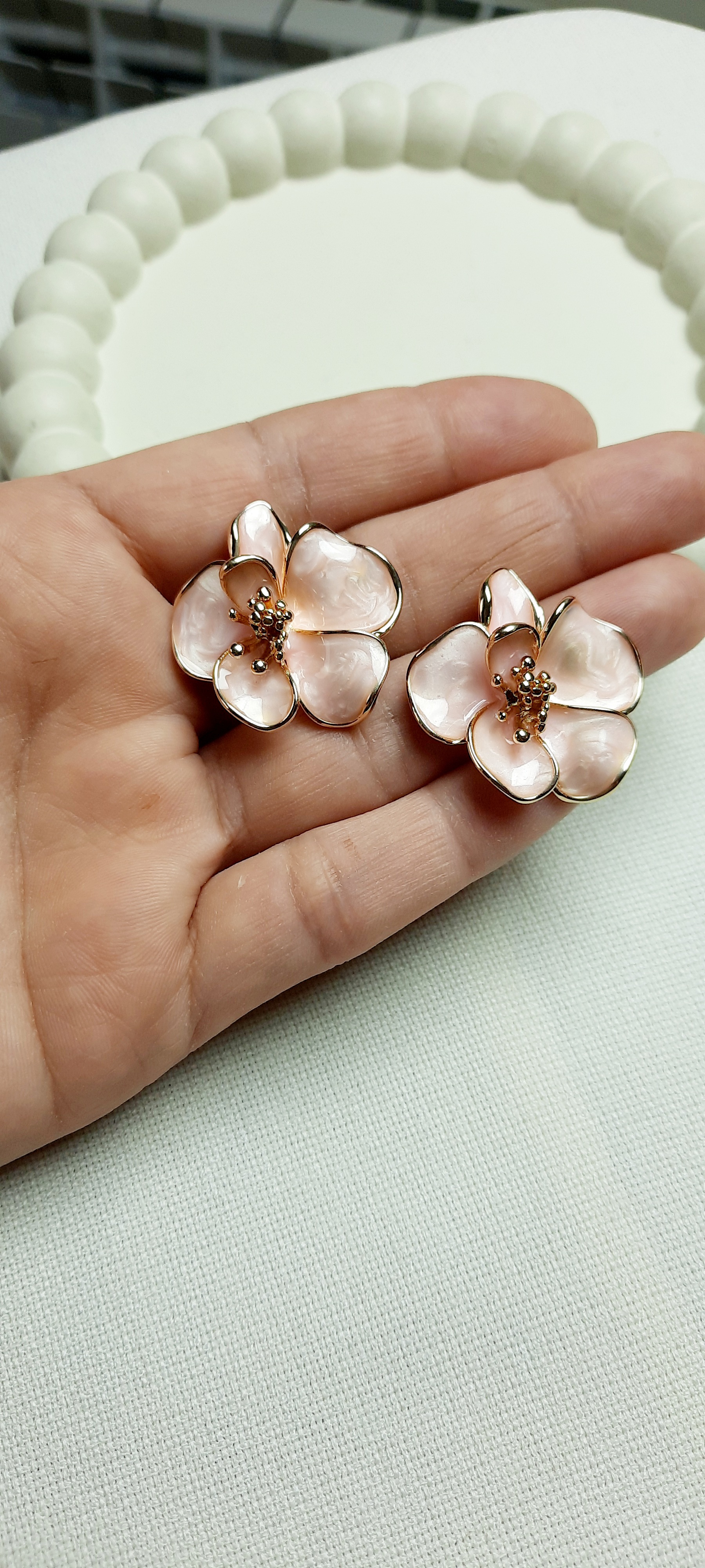 گوشواره گل مینا کاری شده صورتی کمرنگ با میخ ضد حساسیت